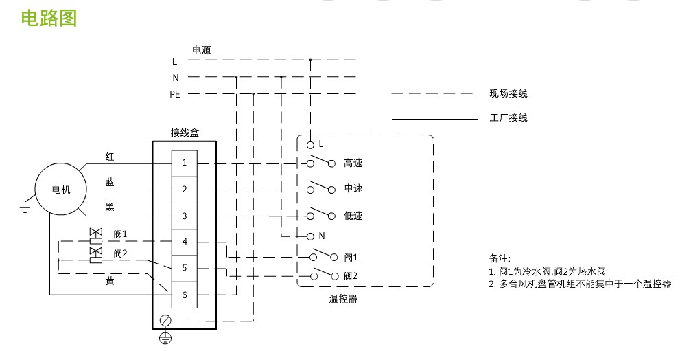 風(fēng)機(jī)盤管簡單控制:使用三速開關(guān)直接手動(dòng)控制風(fēng)機(jī)的三速轉(zhuǎn)換與啟停。
